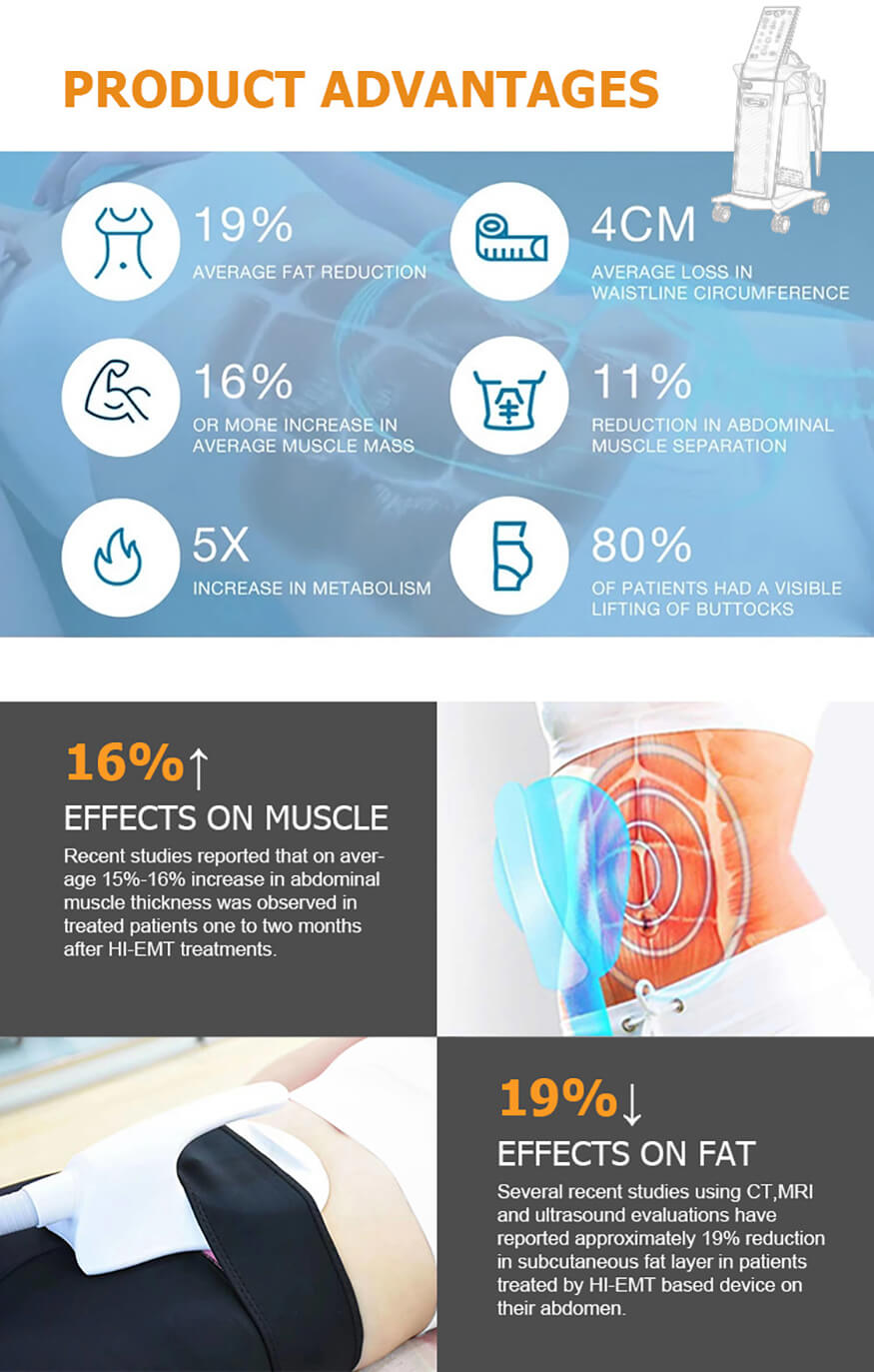 . You can expect a 19-23 permanent decrease of fat in the abdomen as well as a 16 increase in the muscle fibers. Emsculpt machine is the newest technology that has a good result for muscle rebuilding and fat removal on buttocks and abdomens. The Emsculpt use High.